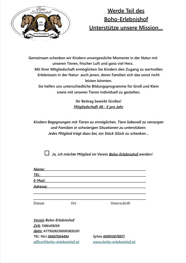 Der BOHO Erlebnishof ist ein eingetragener Verein (ZVR:1586439269) mit Herz und Leidenschaft, der sowohl Jung als auch Alt begeistert. Hier begegnen sich Menschen und Tiere in harmonischer Gemeinschaft. Unsere Tiere sind nicht nur Freunde, sondern auch Lehrmeister für die Kinder und Erwachsenen, die hier jeden Tag neue Erfahrungen sammeln. Bei tiergestützten Aktivitäten erleben die Besucher die Freude und das Vertrauen, das zwischen Mensch und Tier entsteht. Ob beim Füttern der Schafe, pflegen der Ponys oder beim Streicheln der kuscheligen Hasen, der Erlebnishof bietet ein unvergessliches Erlebnis für die ganze Familie.